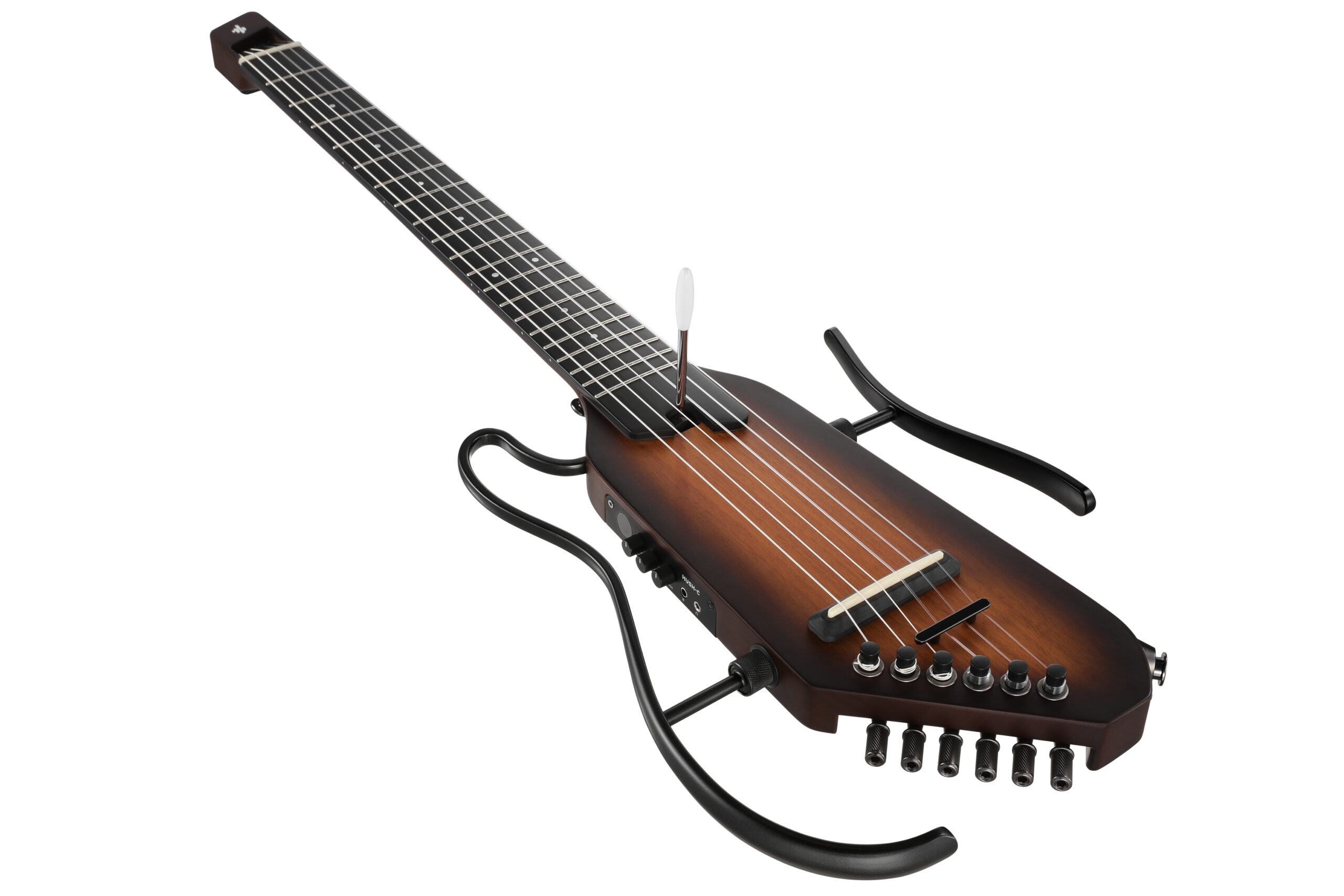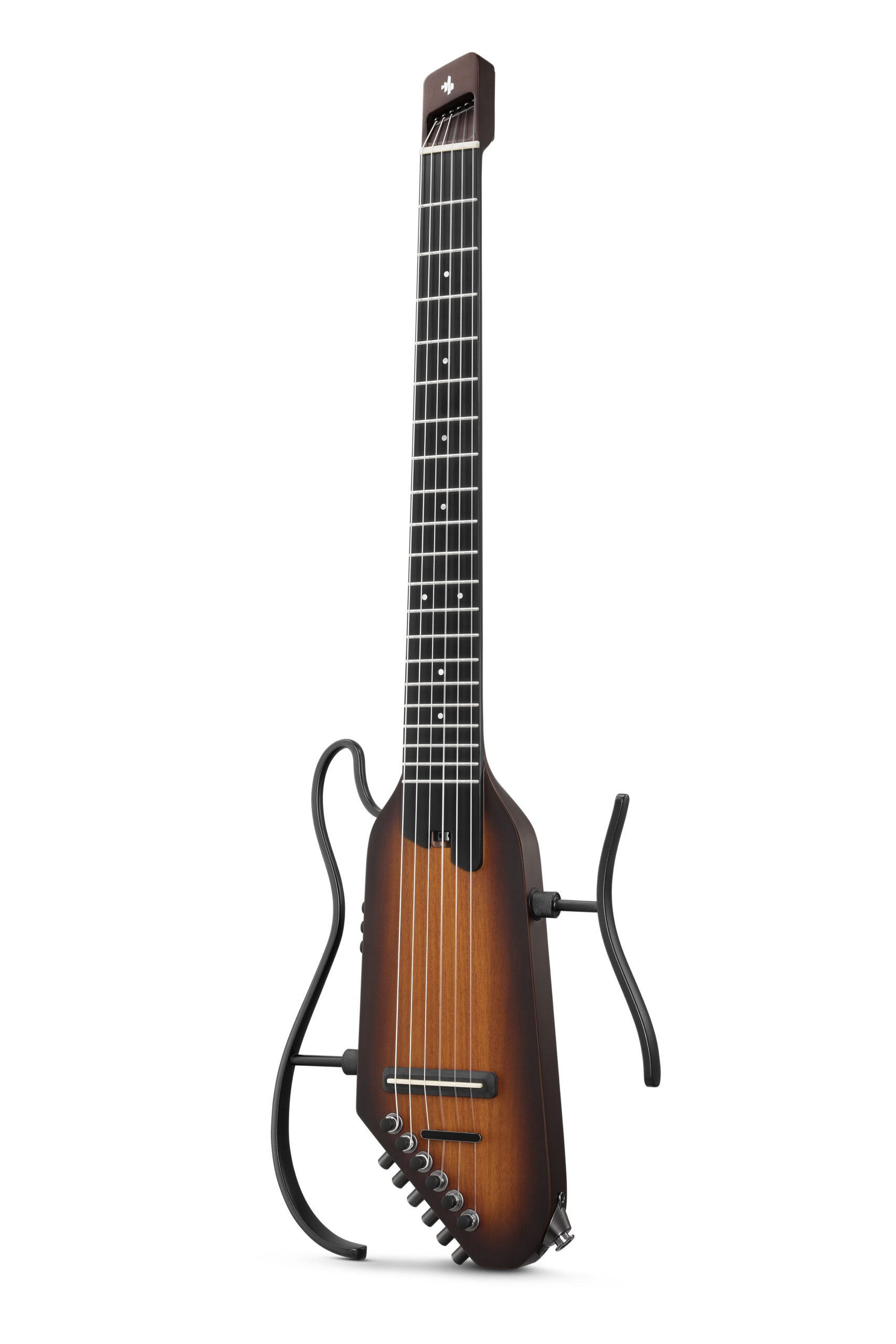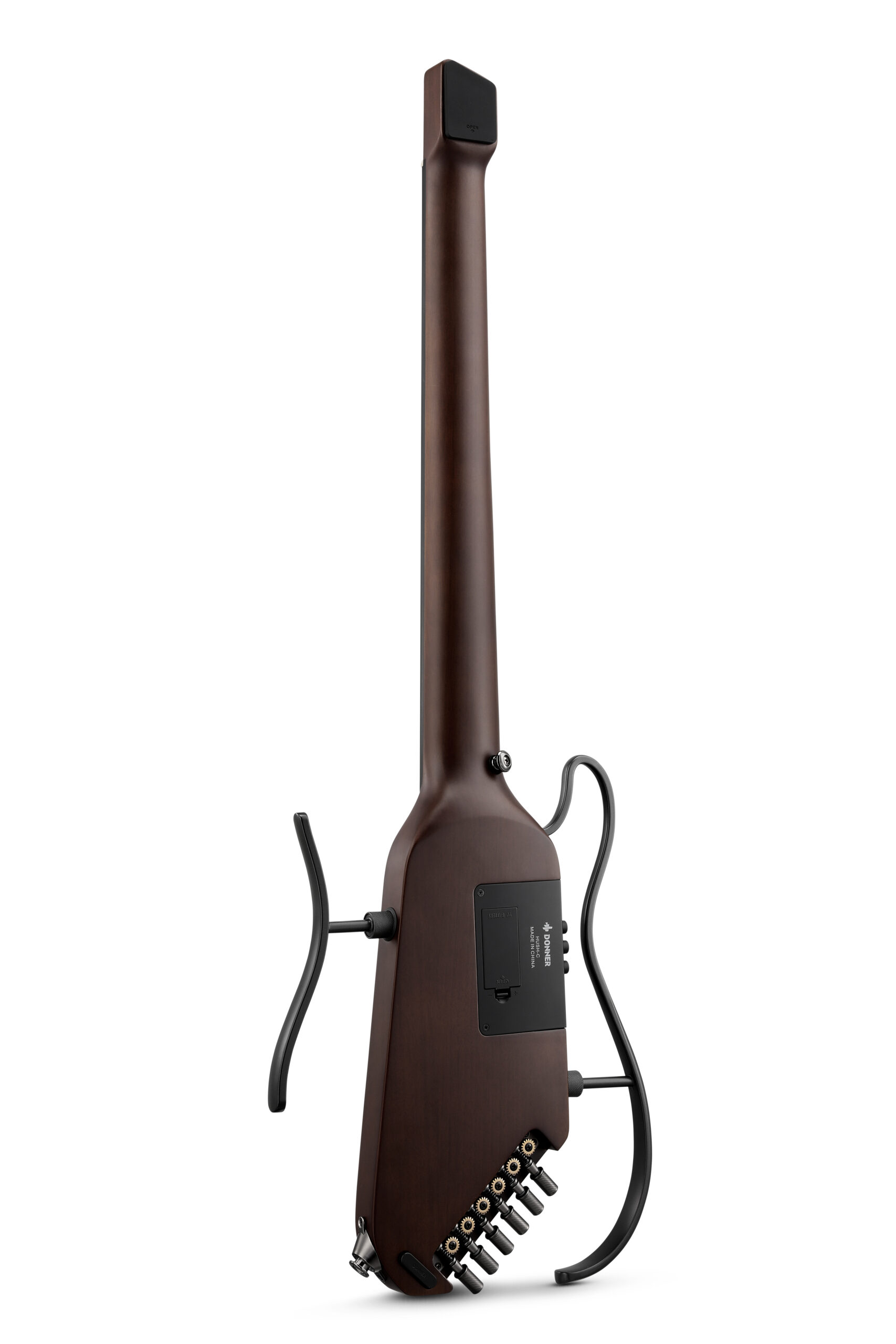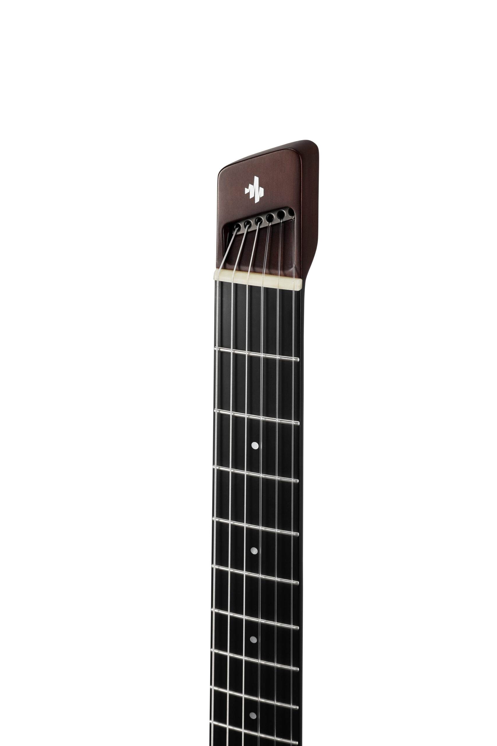 Diseño headless con afinadores en la base del cuerpo para mayor portabilidad.