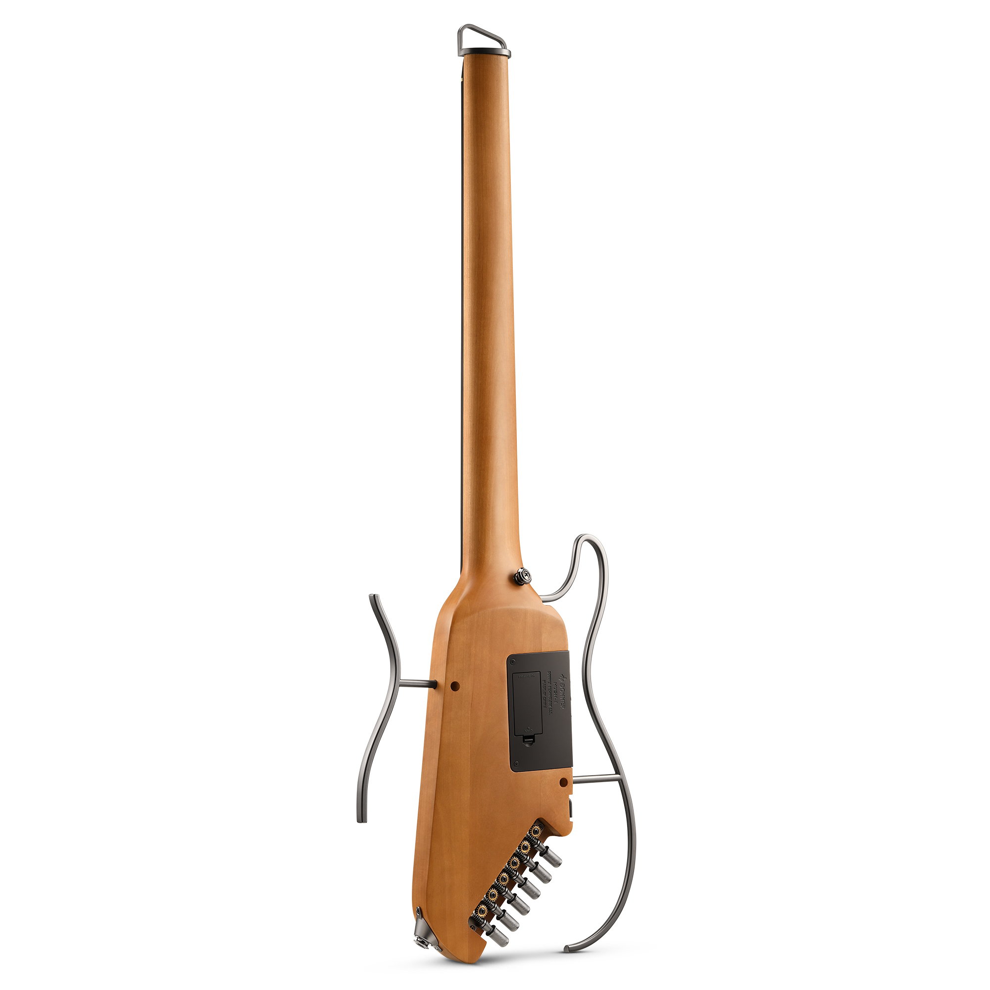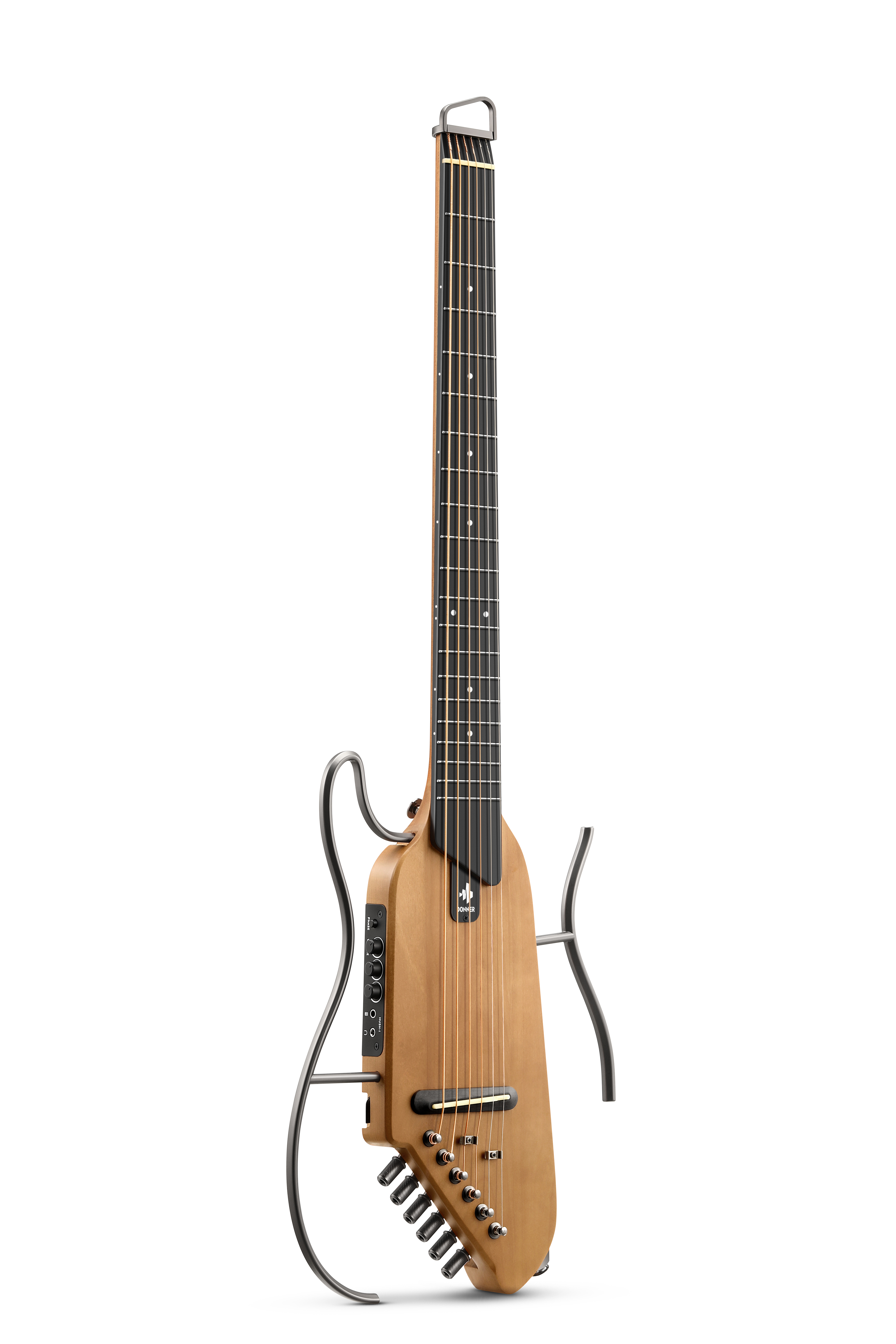 Guitarra electroacústica de viaje HUSH-I Donner color maple, headless, cuerpo compacto (1,76 kg) Cuerdas de Acero. Pastilla piezoeléctrica y preamplificador activo de 2 bandas. Incluye funda, auriculares, correa, afinador, llave Allen, púas y manual. Requiere batería de 9V (no incluida).