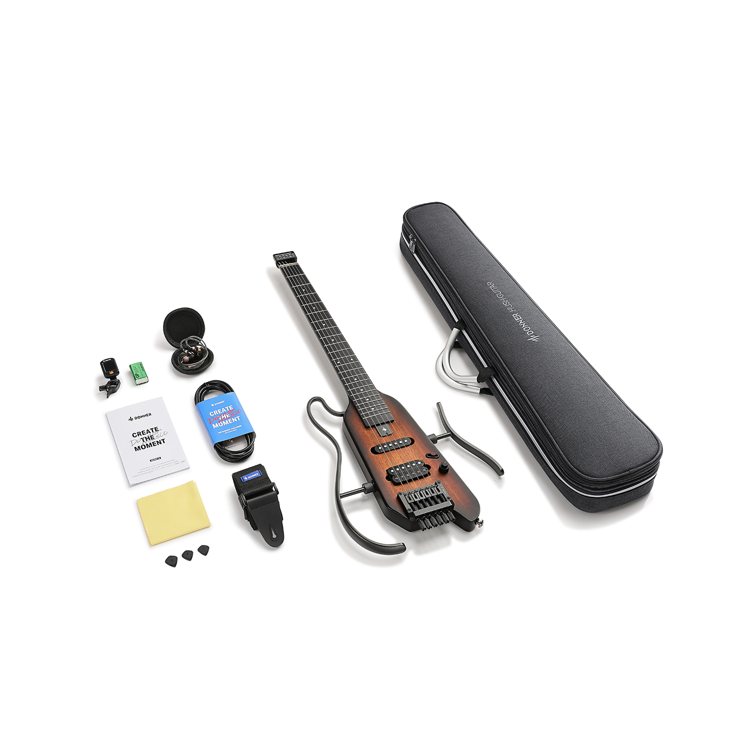Su diseño sin clavijero (headless) y sistema de montaje rápido permiten ensamblarla y desmontarla en segundos, lo que la convierte en una opción práctica para quienes están en constante movimiento. El cuerpo de caoba multicapa y el mástil de arce/caoba con acabado mate ofrecen una sensación sólida y estable, mientras que el diapasón asimétrico progresivo está pensado para reducir la presión en la muñeca y mejorar la ergonomía durante largas sesiones de práctica.