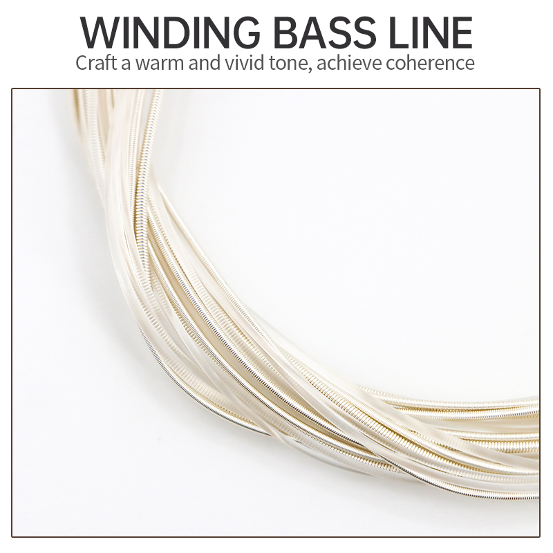 Juego de cuerdas de alta calidad diseñado para ofrecer un sonido cálido, brillante y con gran proyección. Su núcleo interno de nylon proporciona una sensación suave y cómoda al tocar, mientras que la capa externa de aleación de cobre plateado asegura mayor durabilidad y resistencia a la corrosión.