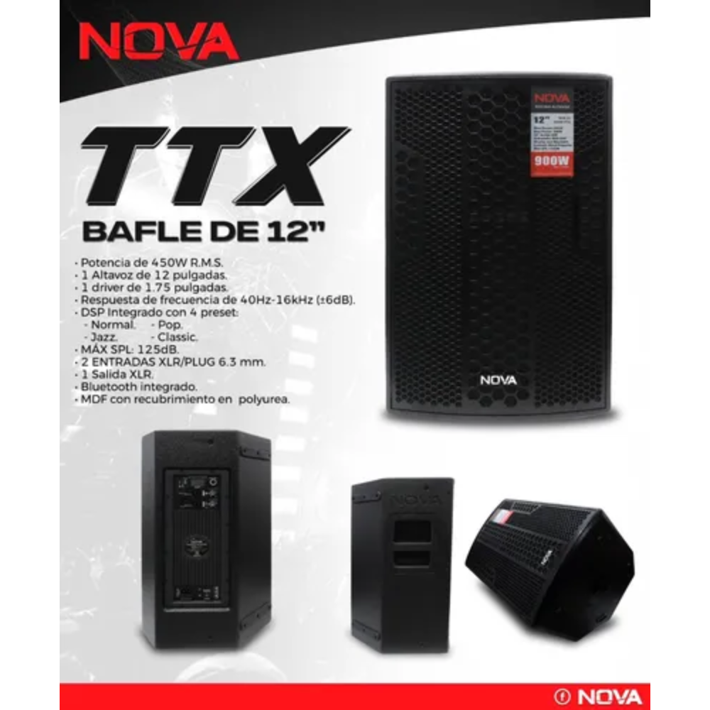 La NOVA TTX cuenta con 2 entradas XLR/Plug 6,3 mm, 1 salida XLR y Bluetooth integrado, permitiendo conectividad flexible y reproducción inalámbrica desde dispositivos móviles. Su cajón de MDF con cobertura de Polyurea garantiza durabilidad, resistencia y un acabado elegante, ideal para uso en escenarios, eventos en vivo, DJs y sistemas multimedia profesionales.