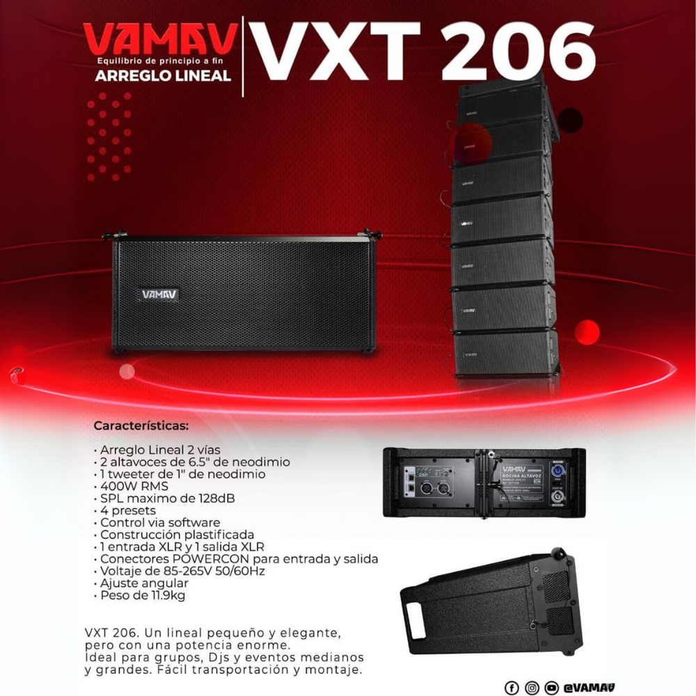 El VAMAV VXT 206 es un sistema de arreglo lineal compacto y elegante, diseñado para ofrecer un rendimiento sonoro excepcional en eventos de tamaño mediano y grande. Su diseño portátil y robusto lo hace ideal para grupos musicales, DJs, productoras de eventos y empresas de sonido profesional que buscan una solución potente y versátil.