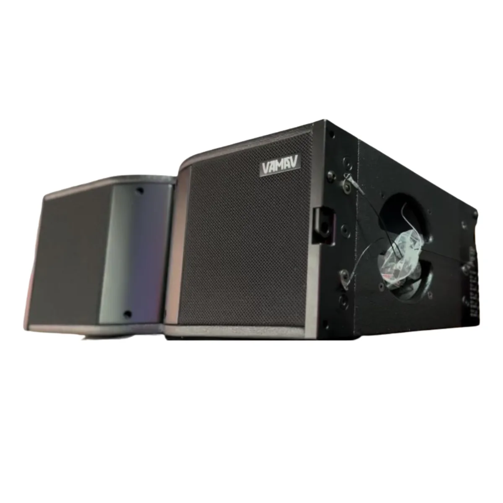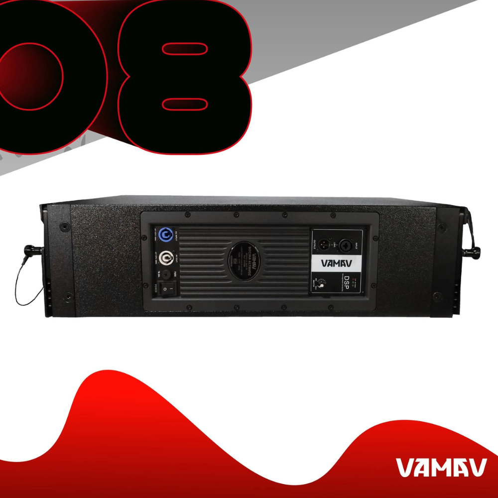 Este módulo cuenta con dos altavoces de 8” para bajas frecuencias, alimentados por un amplificador Clase D con 500W RMS (2000W Peak), y un driver de compresión de neodimio de 3” con diafragma de titanio, impulsado por 150W RMS (600W Peak), garantizando una respuesta balanceada y detallada en todo el espectro de frecuencias.