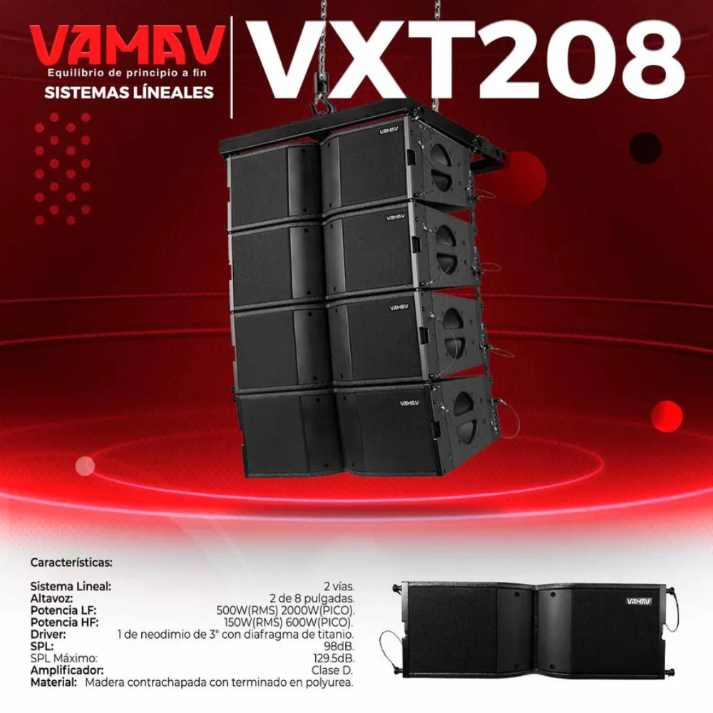 La VXT208 es una bocina tipo Line Array activa diseñada para aplicaciones profesionales que requieren alta fidelidad, presión sonora y portabilidad. Su configuración de 2 vías combina eficiencia, potencia y claridad, lo que la convierte en una excelente opción para conciertos en vivo, eventos corporativos, iglesias y sistemas instalados.